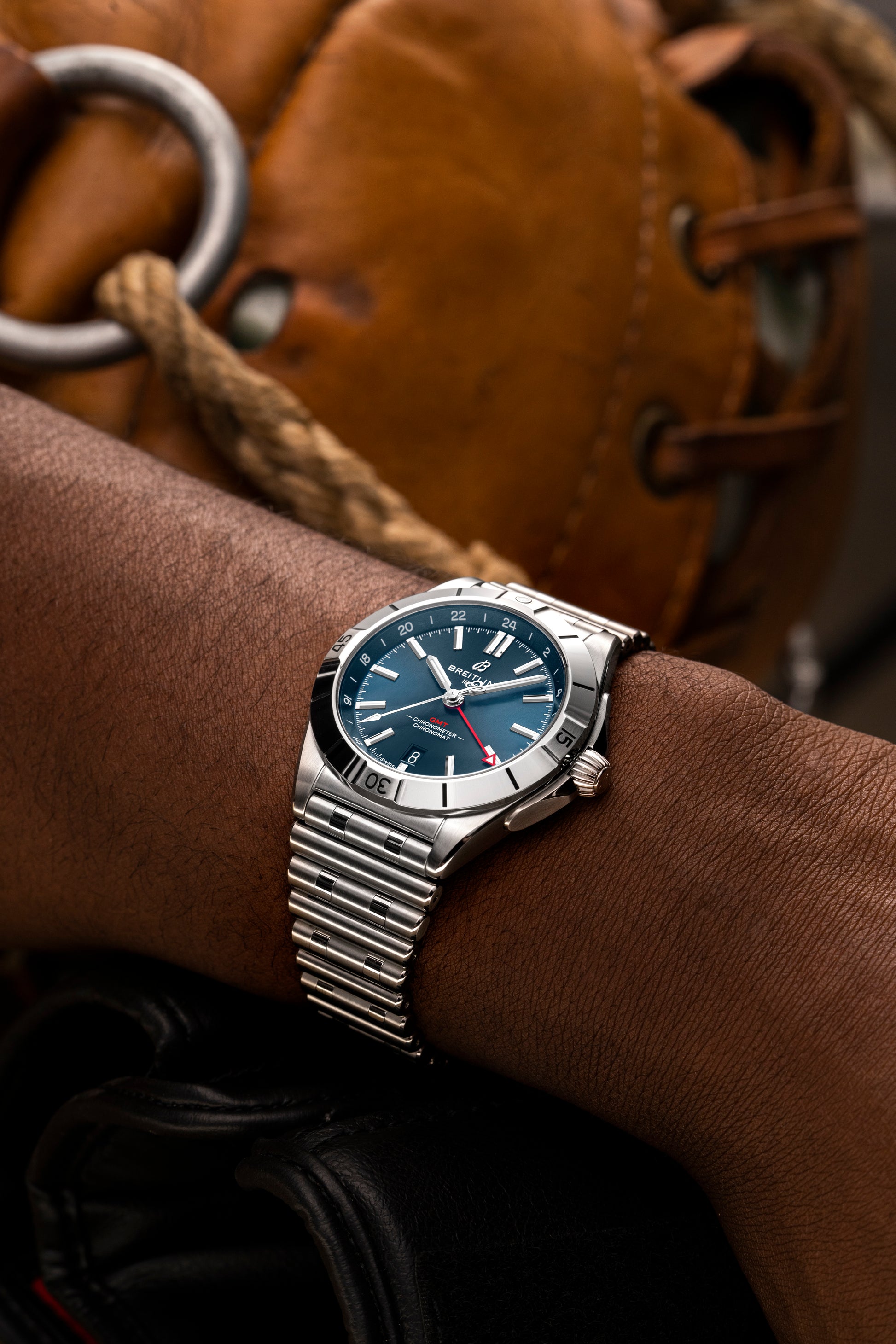 Die Chronomat Automatic GMT 40 ist Breitlings Verbeugung vor der Weltreise – nicht nur dank des Zifferblatts, das zwei Zeitzonen anzeigt, sondern auch dank ihrer legeren Ästhetik. Das dezente Zusammenspiel von Zifferblättern sowie Gehäusen und Armbändern aus Edelstahl passt zu jeder Garderobe. Zugleich unterstreicht die Ton in Ton gehaltene 24-Stunden-Skala den roten GMT-Zeiger. Angetrieben wird die GMT-Komplikation vom Breitling-Kaliber 32. Dank der 24-Stunden-Skala kann der Nutzer eine zweite Zeitzone mitverfolgen und weiss auf Anhieb, ob es dort Tag oder Nacht ist, während die «Zwiebelkrone» (ein klassisches Merkmal der Chronomat, das seinen Namen der geriffelten Kuppelform verdankt) einfache Einstellungen ermöglicht. Als Allzweck-Sportuhr ist die GMT 40 in allen Universen von Breitling zu Hause – zu Land, zu Wasser und in der Luft – und punktet mit einer beeindruckenden Wasserdichtigkeit bis 200 m. Die Mission der Chronomat, «eine Uhr für alle Zwecke» zu sein, ist dank der praktischen Grösse und des dezenten Stils der GMT 40 heute mehr denn je Realität. Robust genug fürs Fitnesscenter, doch auch mit der nötigen Eleganz für den Abendanzug – wenn es je eine Uhr zum Reisen gab, dann ist es diese.