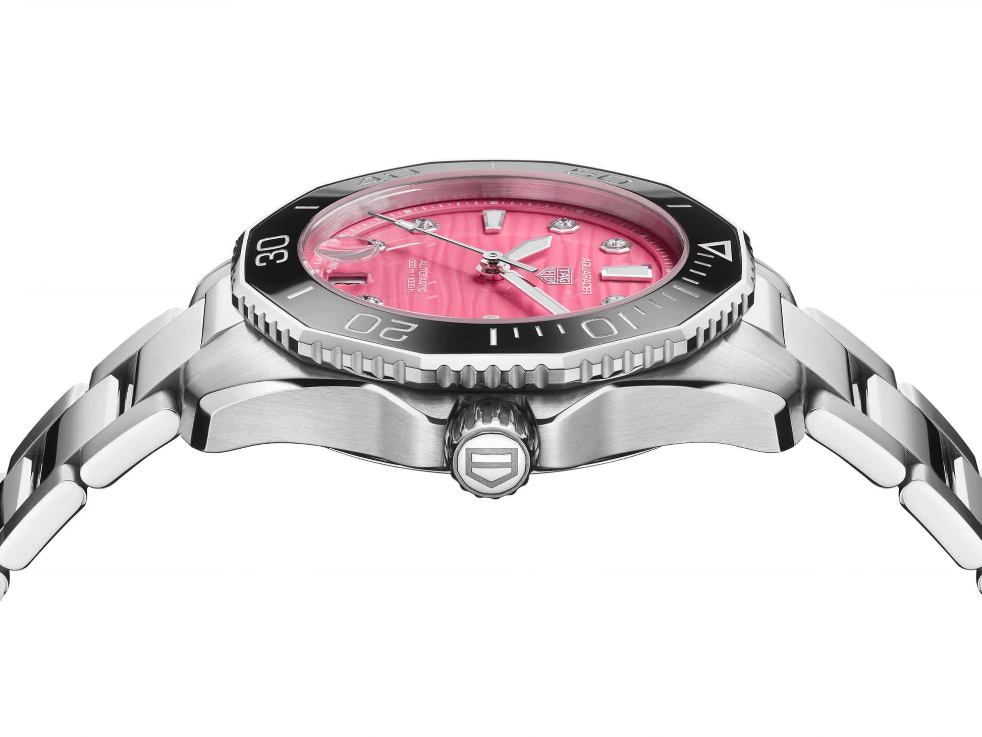 Diese TAG Heuer Aquaracer ist eine echte Taucheruhr, die mit ihrem 36-mm-Gehäuse und einem neuen Zifferblatt in kräftigem Rosa hohe Wellen schlägt. Das druckfeste Profimodell mit Wellenmotiv hält allen Bedingungen stand und ist ein unverzichtbarer Verbündeter beim Erreichen Ihrer Ziele.