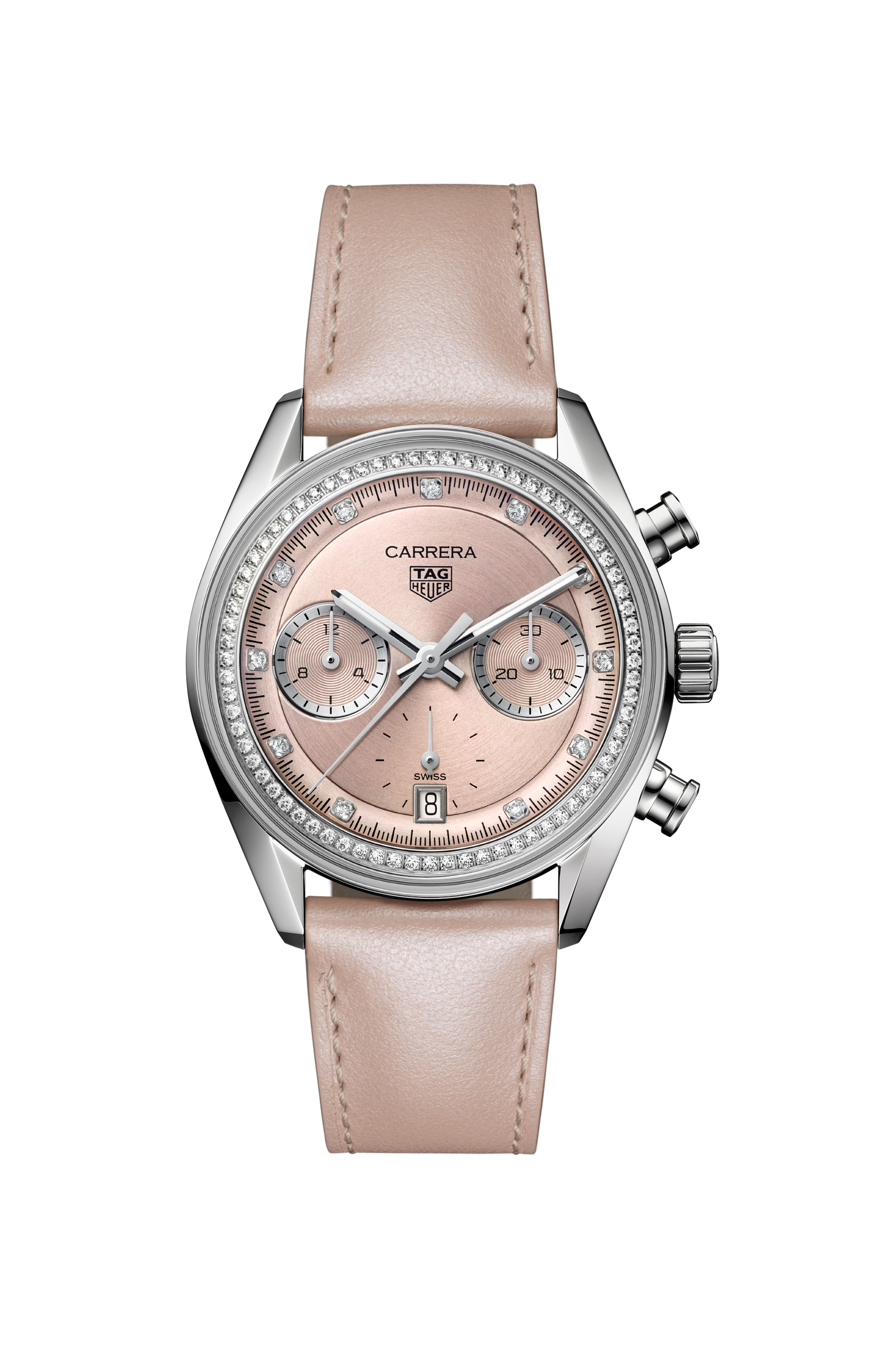 Dieser TAG Heuer Carrera Chronograph mit 39 mm großer Silhouette verkörpert Weiblichkeit und Rennsportgeist. Sein zartrosa Zifferblatt und der Glanz der Diamanten schaffen eine luxuriöse und sportliche Ästhetik.