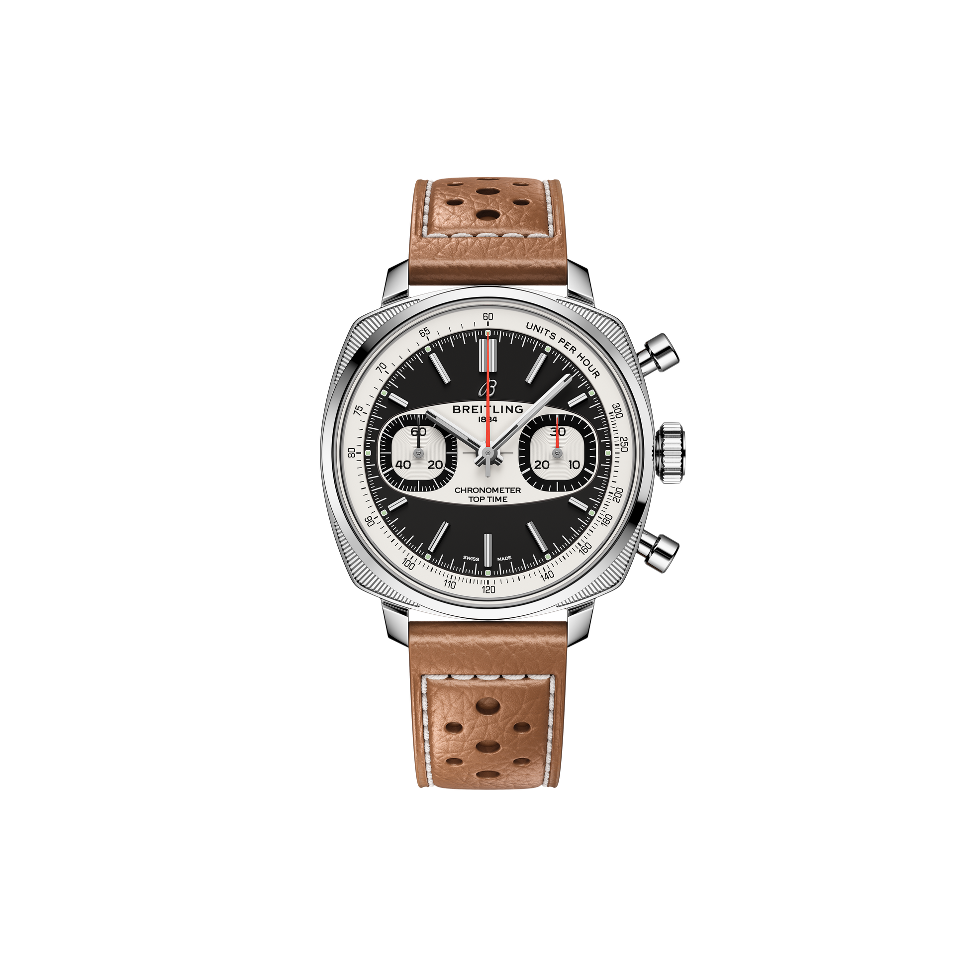 Die in den 1960er Jahren eingeführte, unkonventionelle, vom Rennsport inspirierte Chronographenlinie von Willy Breitling fing die freizügige Atmosphäre dieser Ära ein. Heute verkörpert die neue Top Time-Kollektion diese adrenalingeladene Energie und verbindet modernes Retro-Design mit innovativer Leistung. Die Top Time Racing ist ein Nachfolger einiger der eindrucksvollsten Top Time-Designs aus den 1960er Jahren. Das kissenförmige Gehäuse, die markante Tachymeterskala und die unverkennbaren Hilfszifferblätter in der Form von Superkreisen erinnern an die hohen Geschwindigkeiten und die sekundenschnellen Entscheidungen auf der Rennstrecke. Das Herzstück des Zifferblatts ist das charakteristische «Surfboard»-Motiv – ein elliptisches Design, das direkt aus den Top Time-Archiven stammt und von den Armaturenbrettern der Oldtimer inspiriert ist.