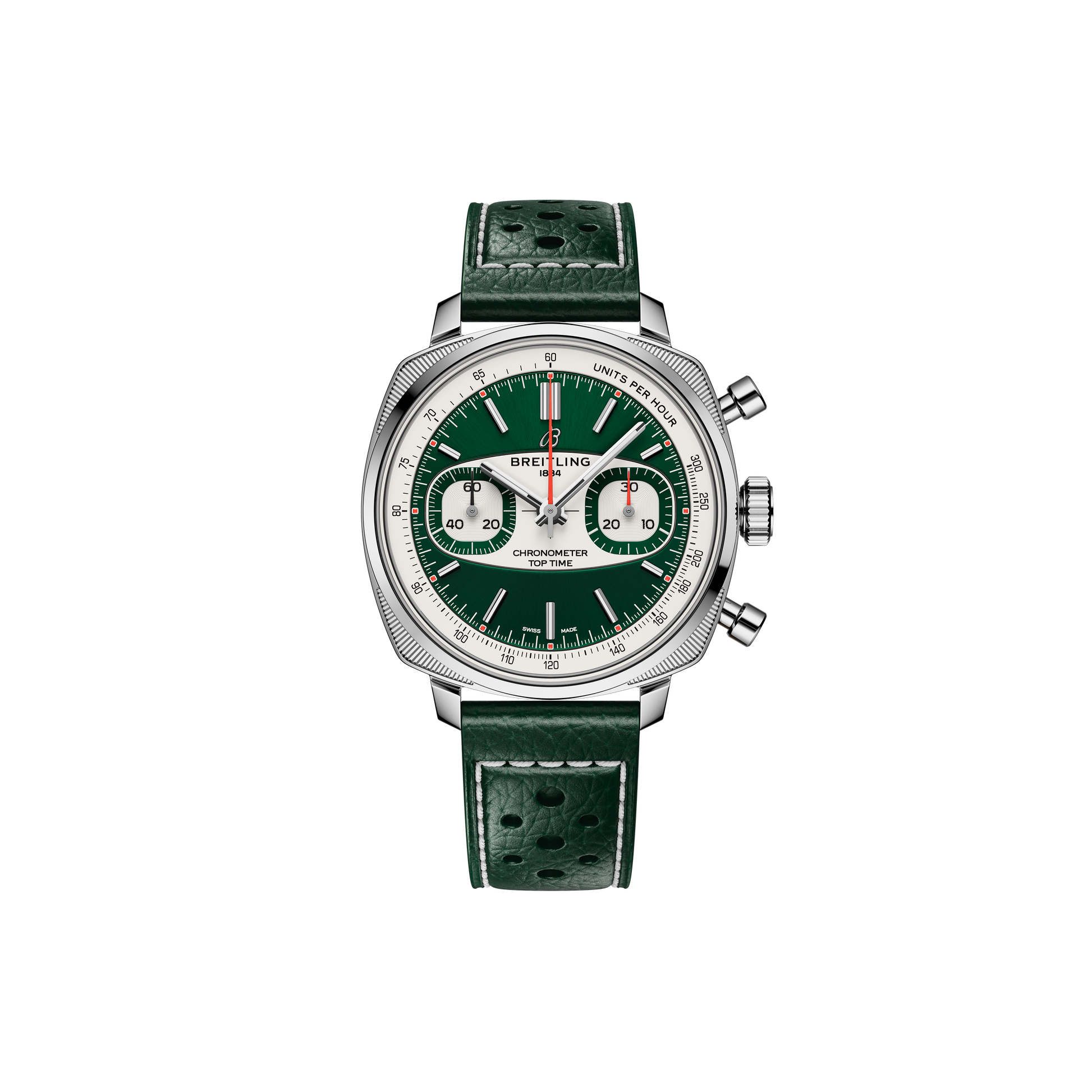 Die in den 1960er Jahren eingeführte, unkonventionelle, vom Rennsport inspirierte Chronographenlinie von Willy Breitling fing die freizügige Atmosphäre dieser Ära ein. Heute verkörpert die neue Top Time-Kollektion diese adrenalingeladene Energie und verbindet modernes Retro-Design mit innovativer Leistung. Die Top Time Racing ist ein Nachfolger einiger der eindrucksvollsten Top Time-Designs aus den 1960er Jahren. Das kissenförmige Gehäuse, die markante Tachymeterskala und die unverkennbaren Hilfszifferblätter in der Form von Superkreisen erinnern an die hohen Geschwindigkeiten und die sekundenschnellen Entscheidungen auf der Rennstrecke. Das Herzstück des Zifferblatts ist das charakteristische «Surfboard»-Motiv – ein elliptisches Design, das direkt aus den Top Time-Archiven stammt und von den Armaturenbrettern der Oldtimer inspiriert ist.