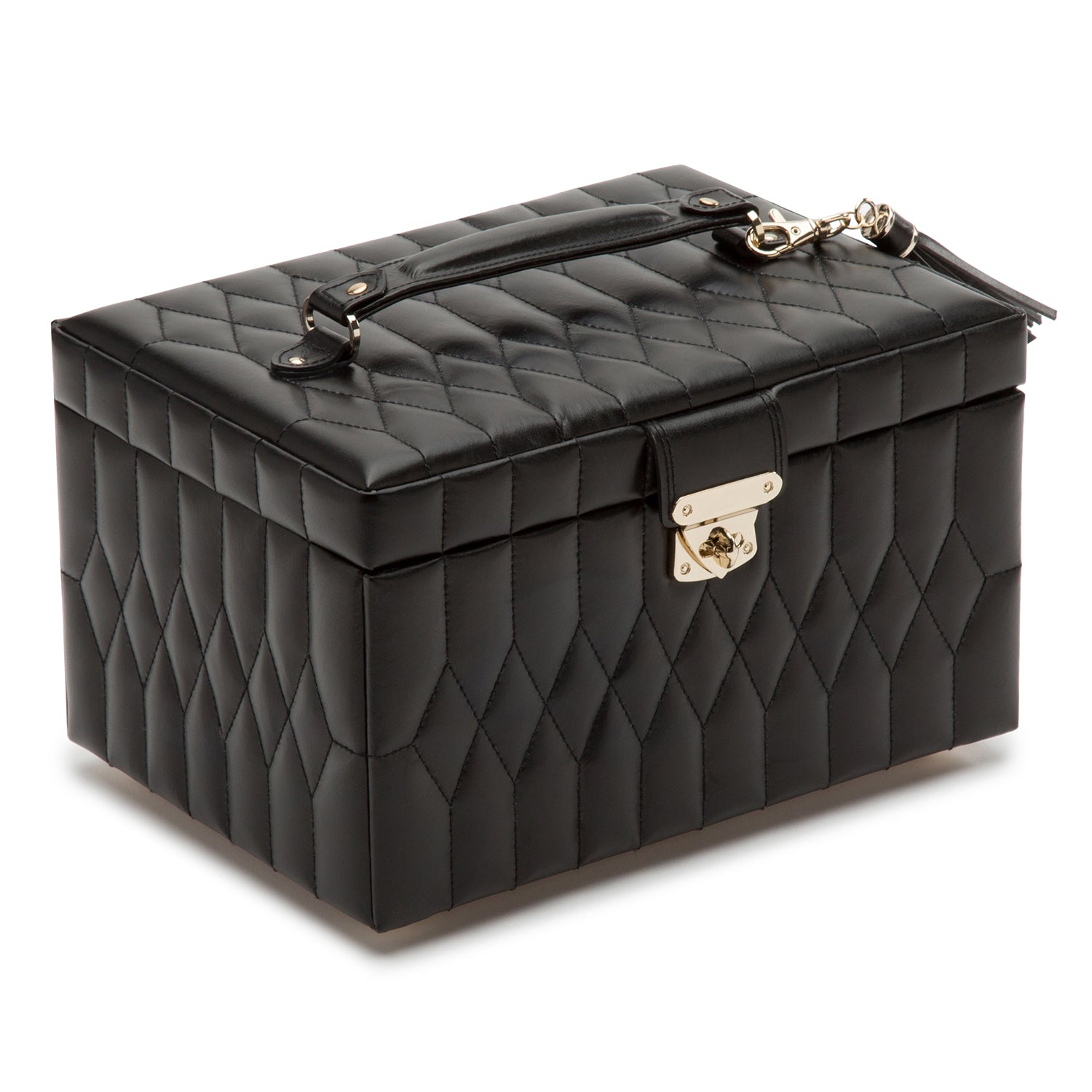 Die kleine Schmuckschatulle Caroline ist ein zeitloser Klassiker mit eleganten, weichen Linien der 50er Jahre, geschmeidigem, diamantgestepptem Leder und goldenen Beschlägen. Dieses raffinierte Etui ist das perfekte Zuhause für Ihren wertvollen Schmuck und Ihre Erbstücke.